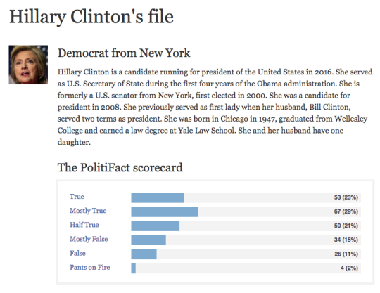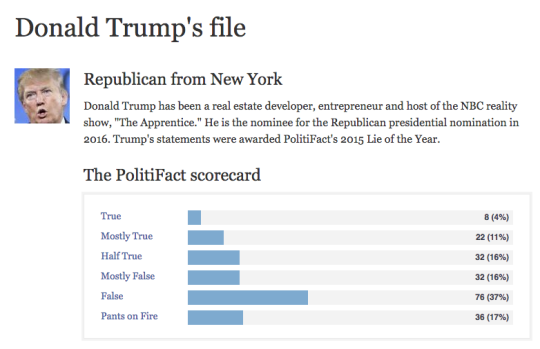 I think the two bits that are vital are Pants on Fire (Clinton 4%, Trump 36%) and True (Clinton 53%, Trump 8%).
