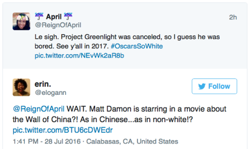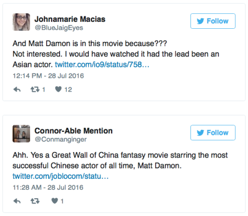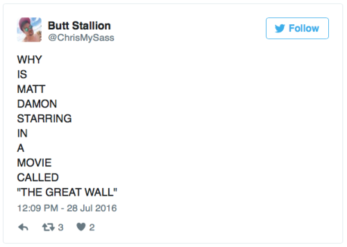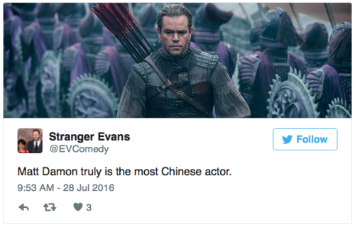 Matt Damn gets all the screen time in The Great Wall trailer and people are pissedThe new trailer for the action film The Great Wall starring Matt Damon may have more in common with Donald Trump’s proposed wall than China’s — because it’s pretty good keeping out people of color. And the poster is even worse.