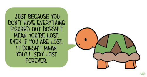 [drawing of an orange turtle in a brown and green shell saying“Just because you don’t have everything figured out doesn’t mean you’re lost. Even if you are lost, it doesn’t mean you’ll stay lost forever.”in a green speech bubble.]