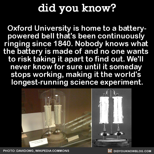 Oxford University is home to a battery- powered bell that’s been continuously ringing since 1840. Nobody knows what the battery is made of and no one wants to risk taking it apart to find out. We’ll never know for sure until it someday stops working, making it the world’s longest-running science experiment. Source Source 2