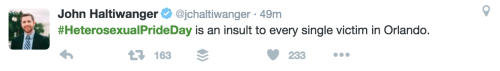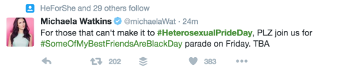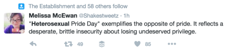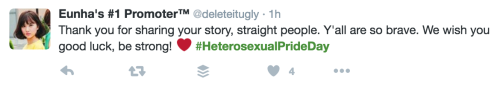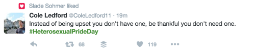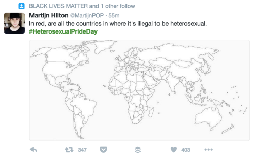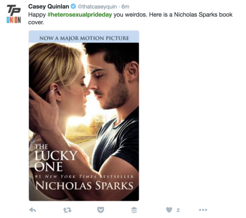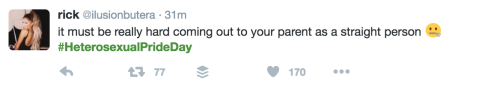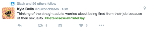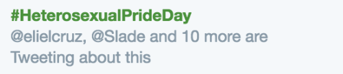 #HeterosexualPrideDay is the top trend on Twitter right now.Thankfully, it’s almost entirely LGBTQ people (or reasonable straight/cis people) calling out how absurd, self-centered and downright offensive the hashtag is. Still unclear whether it was started by terrible straight people or by trolls. Ugh.
