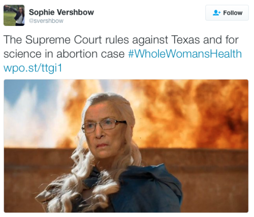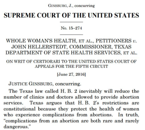 On Monday, the Supreme Court tendered its first abortion-related decision in more than 10 years — and came down firmly on the side of choice. In herconcurrent opinion, Ruth Bader Ginsburg eviscerated the Texasabortion lawand its blatant hypocrisy.