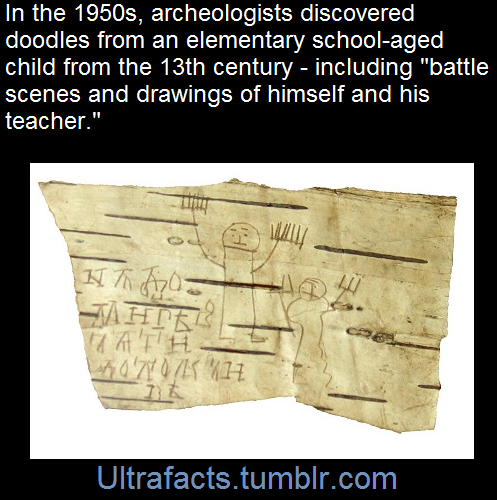 Onfim was a child who lived in Novgorod, Russia, in the 13th century. He left his notes and homework exercises scratched in soft birch bark (beresta)which was preserved in the clay soil of Novgorod.Onfim, who archaeologists believe was six or seven at the time, wrote in Old Novgorodian; besides letters and syllables, he drew battle scenes and drawings of himself, his family, and his teacher. [x]