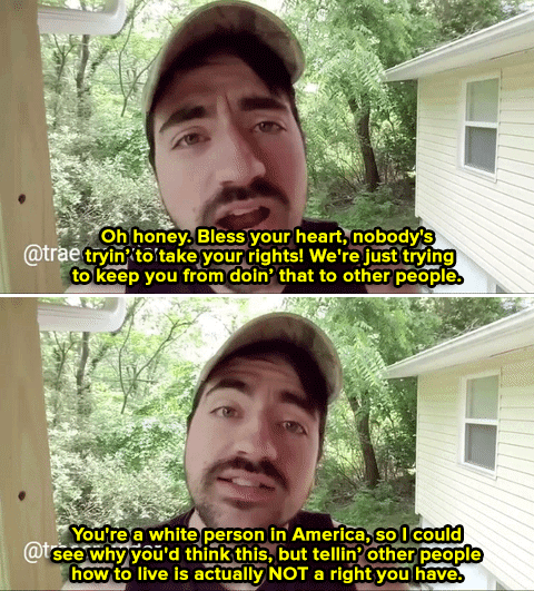 Watch: “Liberal Redneck” suggests some othercountries where these bigots can go live.“You’re a white person in America, so I could see why you’d think this, but tellin’ other people how to live is actually NOT a right you have.”