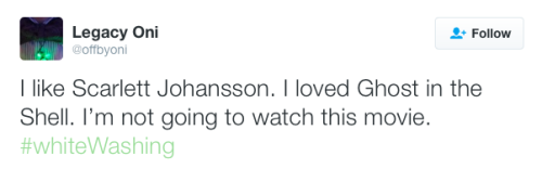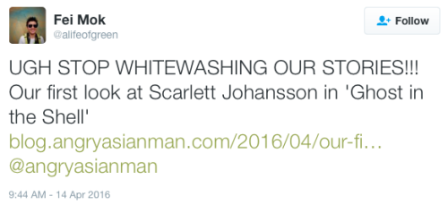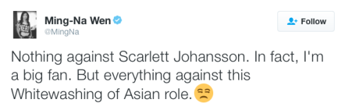 Ghost in the Shell whitewashing continues to fuel online backlashHollywood still is not learning its lesson when it comes to whitewashing and yellow face. A new photo released today showsScarlett Johansson as Motoko Kusanagi in the upcoming adaptation of Ghost in the Shell, sparking Ming-Na Wen and many others to speak out online. This isn’t even the first example of Hollywood whitewashing this week.Cough cough Marvel.