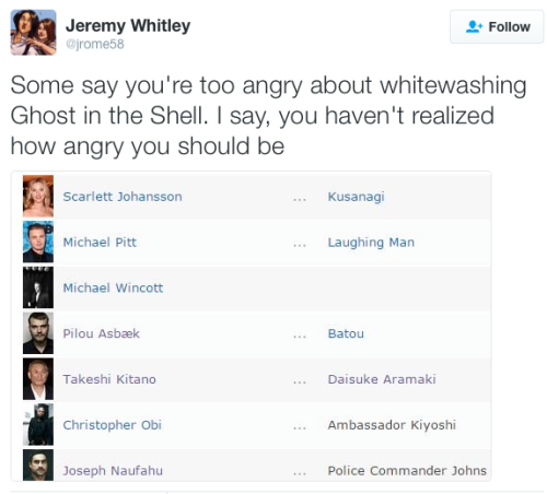 Ghost in the Shell whitewashing continues to fuel...