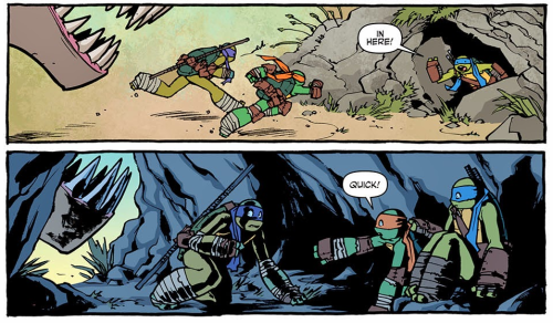 I hadn’t taken a closer look at the details in these panels but Donnie protecting his mask tails while running hahaha