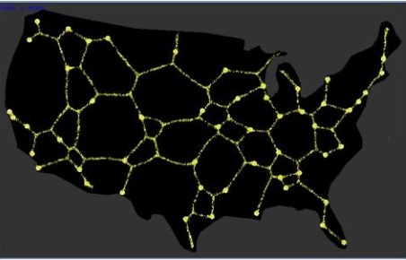 Slime mold was grown on an agar gel plate shaped like America and food sources were placed where America’s large cities are.