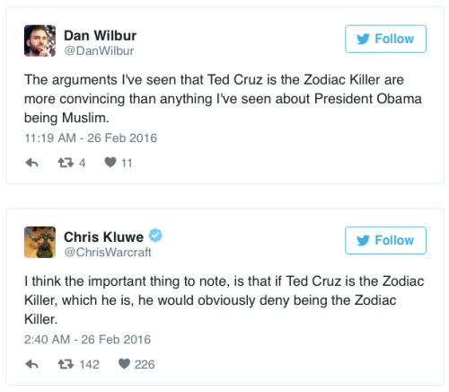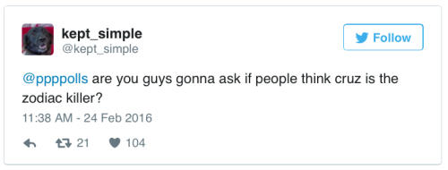 38% of Florida voters think Ted Cruz could be the Zodiac KillerIn Florida, PPP found that 10% of voters believed Cruz to be the famous serial killer while 28% of voters were “not sure.” Taken as a whole, that’s nearly 4 in 10 Floridians who were at least open to the possibility. (Sadly, there’s some pretty hard evidence against Cruz being the Zodiac.)