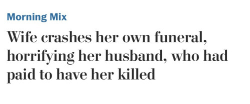 The headline isa bit misleading as she didn’t really crash the funeral–she sat outside waiting in her car and, after the mourners had gone home, walked up to her husband andwas like"Surprise! I’m alive!“