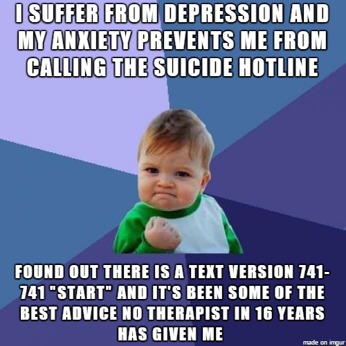 Please reblog. There is a text version of the suicide hotline. Help is out there. Stay strong. I’ve been there. Asking for help is NOT a sign of weakness. Stolen from ImgUr.