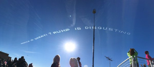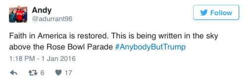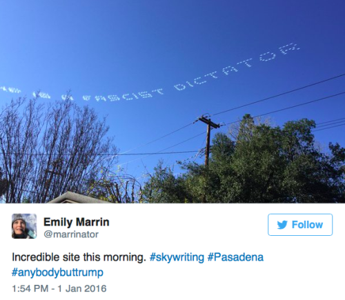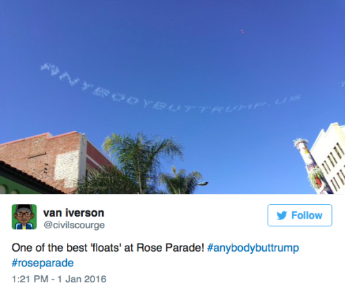 Anti-Trump skywriting stole the show at the Rose ParadeAgainst the stark blue California sky, skywriters wrote, “America is great! Trump is disgusting,” “Anyone but Trump” and “Trump is a fascist dictator.” The skywriting also pointed users toAnybodyButTrump.us. CNN identified the people responsible for the message.