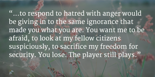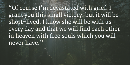 I don’t know who you are and I don’t want to know - you are dead souls. If this God for which you kill indiscriminately made us in his own image, every bullet in the body of my wife will have been a w...