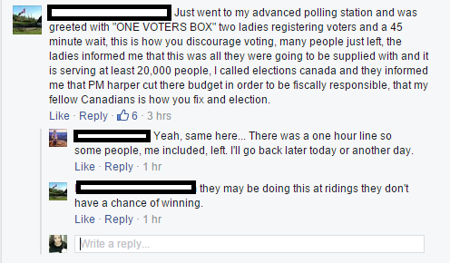 So Elections Canada’s advanced polls may indeed have some uh,“lineup” issues, or at least that’s what FB tells me.
