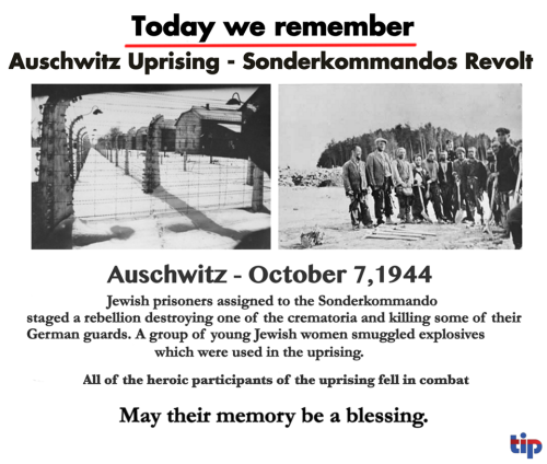 71 years ago today, the brave Sonderkommandos at Auschwitz staged a revolt and destroyed one of the crematoria. Their brave actions slowed down the Nazis murder of Jews and saved countless thousands of lives.