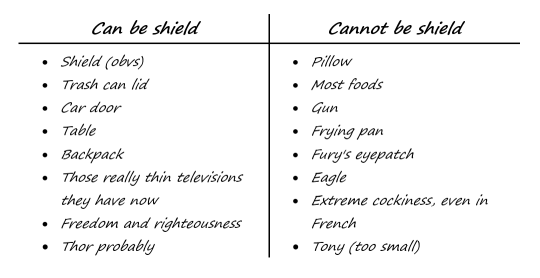 in fact, I’m going to go ahead and headcanon that he keeps a list of things he’s tried using as a shield and whether or not they’ve worked out: