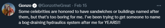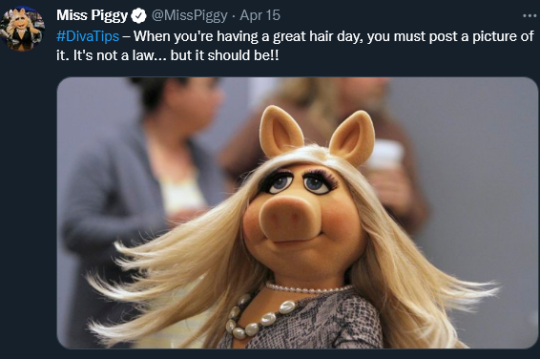 that muppet post reminded me, most if not all of the main muppets have twitter pages. Fav has gotta be Miss Piggys, which is filled with selfies and vaguely uplifting text thats also egocentric. all the comments are people complimenting her and being like “YAS QUEEN”