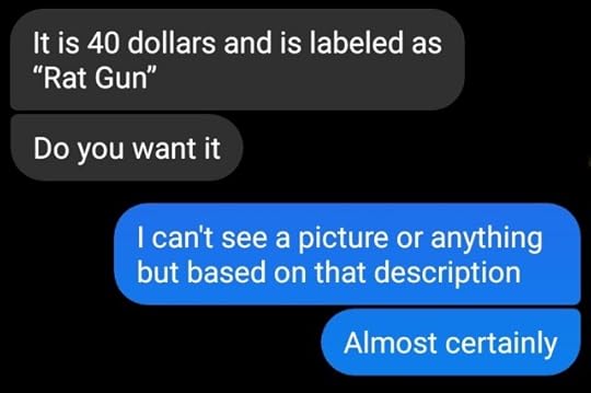 This is better than I’d ever hoped for, I bet a rat could kill you with that thing by firing a laser back in time and electrocuting your gran...