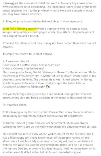 Aziraphale has a listening corner in Maggie’s record shop! 🥰 (second photo)