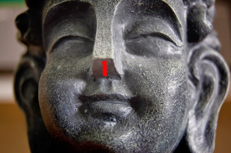 The breath naturally shifts between the left and right nostrils and flows through sushumna for a brief moment. Our goal is to get it flowing through sushumna, most of the times. I would like to introduce a simple technique which would work readily for many. It is possible to shift the flow of breath with the mind itself. The best way to keep the breath flowing through sushumna is to keep the focus/awareness on the bridge between the nostrils. In the picture, I have shaded that region red. The statue seems not to have hole for the nostrils.. Never mind! :) Good luck on the path of self mastery!
