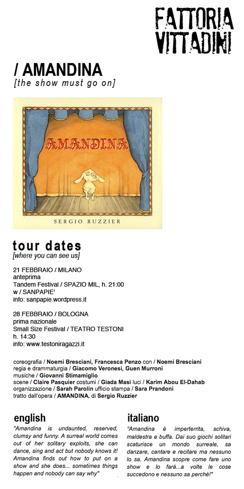 , that is about a little dog who puts up a show. Unfortunately I will not be able to attend, but if you are in Milan on Febraury 21 or in Bologna on February 28, please go see it!