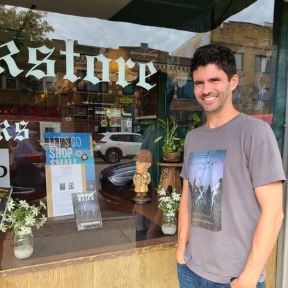 Here I am last year outside Centuries & Sleuths Bookstore in Forest Park where they displayed my book, Neighborhood Watch.
