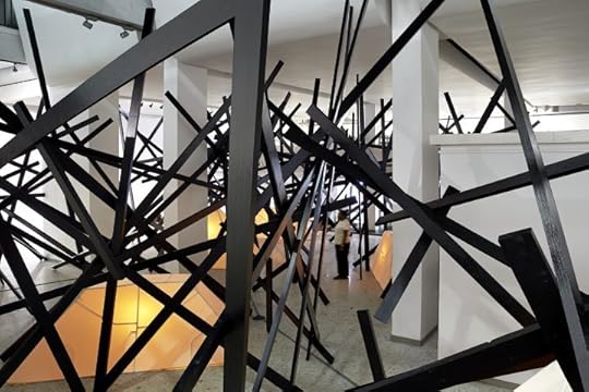 “Structural Response V,” Serge Alain Nitegeka (2025). Photo Nina Lieska. Courtesy Stevenson Gallery.Structural Response V is the latest iteration of Nitegeka���s iconic large scale all-black wooden plank installations that have been widely exhibited in South Africa and overseas. In these installations, visitors are immersed and made to feel small in relation to the scale of the beams that cross above and around them at sharp angles. There is a sense of danger for those who visit the installation. Movement is difficult, but not impossible, echoing the hurdles migrants have to go through as they move from country to country. At WAM, the Structural Response V had a new addition in between the wooden beams: tents lit with a warm light from the inside, giving the impression of occupied spaces. The tents had been previously shown as Camp, a standalone outdoor installation at Nirox Sculpture Park (2025) and Spier Light Art Festival (2025), but never shown as part of the Structural Response. The contrast between the softness of the tents and the hostility of the beams is not only material, it is conceptual. That is, while the beams signal to the hardships of forced migration, the tents point towards a private moment of leisure and rest. These temporary shelters evoke the existence of scenes that the audience does not, cannot, access. Visitors can, however, get close enough to witness that fictional intimacy inside the tents and be part of it as observers.