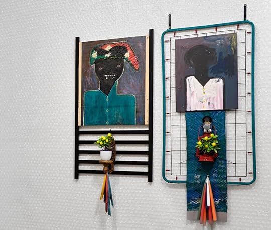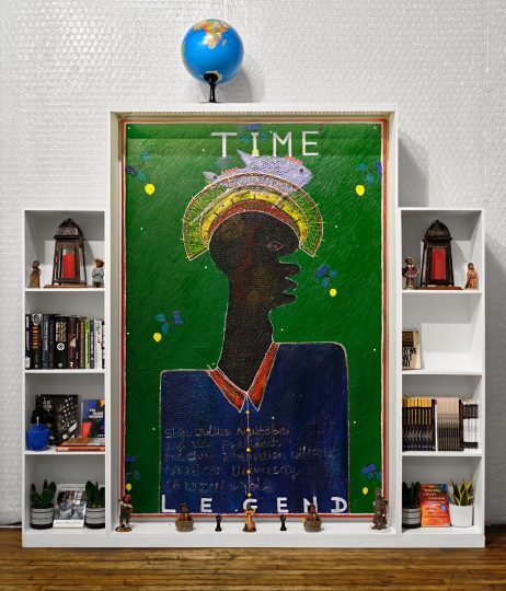 Adjani Okpu-Egbe, "Sisiku AyukTabe, the Martin Luther KING Jr. (MLK) of Ambazonia," 2021, mixed media on canvas mounted on customized wooden bookshelves with varied object installation, 76 x 79 x 9 in. Image courtesy of the artist and International Studio & Curatorial Program (ISCP); photograph by Shark Senesac. ��� Adjani Okpu-Egbe���I want my work to be the hypothesis to someone else���s research.���