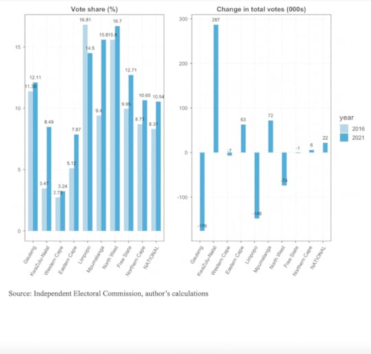 Table 1: The EFF���s growth in 2021 was largely due to the post-July fallout in KZN.The EFF grew extremely rapidly in its early days, and has shown a consistent capacity for impressive street-level mobilization, but has been stagnating at the polls for the last several years. The 10.5 % it netted in local government elections last year, a 2% bump from five years prior, is a poor result given a context favorable to populist messaging. Its growth in 2021 came overwhelmingly from KwaZulu-Natal (KZN) province, where it benefitted���along with all other opposition parties���from the ANC���s hemorrhaging support in the wake of the July unrest (Table 1). In Gauteng and other provinces, it proved as susceptible as other major parties to collapsing turnout, which reflects poorly on its ability to capture anti-political sentiments.