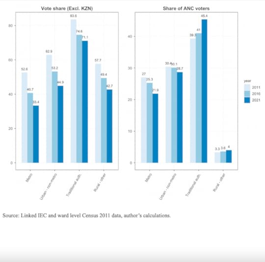 In the countryside, the dilemmas for new parties are magnified. The vast majority of the rural population lives under traditional authorities, which were originally the colonial state���s instruments of indirect rule. Today they���re a somewhat mixed bag: some abide by certain principles of consultative democracy while others, perhaps most, remain firmly in the colonial mold of concentrated patriarchal authority. For whatever reason, they���ve retained far greater legitimacy than other spheres of government (Table 3). Because they facilitate access to mining rights and influence the voting behavior of their ���subjects,��� they���ve become important cogs in the ANC���s patronage machinery, helping to secure its hold over the rural population in exchange for a share of the mineral rents and supportive legislation. Excluding KZN, where the party lost considerable ground to another ethnic formation, ANC support in 2021 held up far better in traditional areas than other parts of the country, declining at half the rate it did in large metros (Table 4).