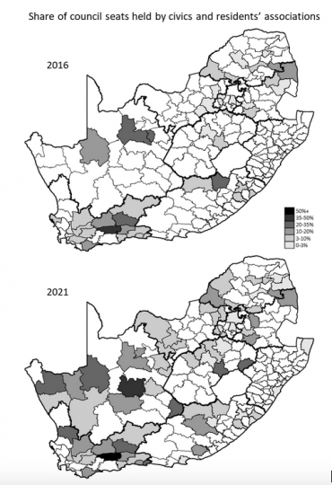 In 2016, civics and residents��� associations claimed 99 council seats in 45 municipalities, with a chance of entering coalitions in 12 of these.�� In 2021, they advanced both intensively and extensively, with 80 associations taking 216 council seats in 76 municipalities, pushing 37 of these toward coalitions. Their collective haul was 1.8% of the national vote, a half-point shy of ActionSA���s. But whereas ActionSA was heavily concentrated in Gauteng, with only 12 seats beyond in KwaZulu-Natal, the rural bias of the civics gives them a more dramatic geographical reach, with a presence across the breadth of the country.