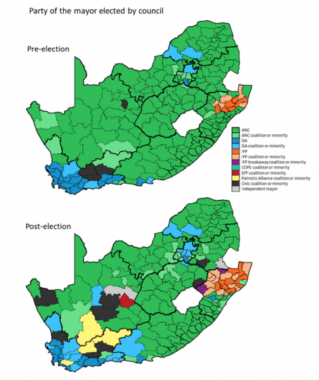Coalition politicsNewly minted municipal councils spent the month of November cobbling together coalitions and electing mayors. The ANC was able to formulate agreements with the Patriotic Alliance and a number of smaller parties. In this way, it secured executive office in the metros of eThekwini (Durban) and Nelson Mandela Bay (Gqeberha), together with twenty other local municipalities. In recompense, it lit four Cape municipalities yellow for the Patriotic Alliance. It lifted civics into the mayor���s chair in the Karoo municipalities of Kannaland (Ladismith) and Prince Albert. It gave eDumbe in the north of KwaZulu-Natal to an IFP breakaway, the National Freedom Party.