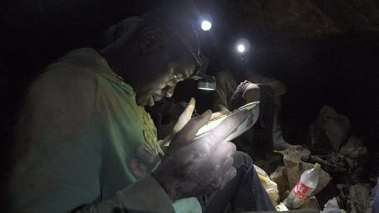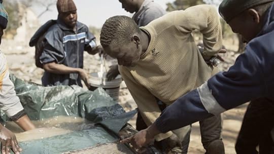 Still from We Are Zama Zama.At its best, the film powerfully offers a glimpse into the everyday lives of these miners. With cameras strapped to the headlamps of the miners, we see them eat, sleep, and crawl through the mines in anticipation of a shaft���s possible collapse. Using mallets, pickaxes, and occasionally dynamite, these men risk death. The extraordinary footage draws in the viewer. As the camera follows the miners, deep into the mines, with emptied bags of millet strapped to their backs, pickaxes, hammers, and short sticks of dynamite, you sense both the resolve and terror these men experience. After days underground the miners ascend from below the surface and the formation of the mineral into gold begins. Footage of women pounding dirt and processing minerals reminds the viewer of the human toil of processing gold without equipment. These are the social worlds.