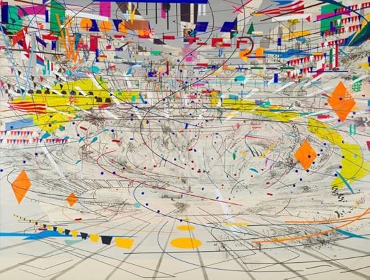 During this period, movement and migration became key questions for Mehretu. Retopistics: A Renegade Excavation (2001) explores mobility in an increasingly globalized and transitory world; tracings of airport floor plans, subway platforms and stations, various spaces of transit and temporariness merge with parts of ancient ruins. Bright, bold geometric shapes shoot across the enormous canvas with centrifugal speed. They are layered over fainter mappings, shadow-like maquettes that appear to move slower in their washed-out blues. Due to the enormity of the painting, the viewer too becomes engaged in these transitory processes as they travel through the work. However, as one approaches the canvas, the painting fragments, as if its unity can only be sustained at a distance, when the multiplicity of layers cannot be fully recognized. Up close, Retopistics is replete with detail: symbols, markings, sparks, delicate ethereal drawings that give a mythical quality. This relationship between scale and detail is perhaps the most remarkable aspect of Mehretu���s mesmerizing cartographies, her ���story maps of no location.��� Her expansive landscapes are constantly unfolding before us, revealing diverging and disorienting perspectives, dizzying details that collide and splinter into alternative geographies.