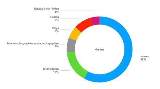 Of the 671 texts that were listed by our respondents, the majority were novels (369) and short stories (101), while memoirs, biographies and autobiographies (46), poems (56), plays (39), essays and non fiction books (28) and anthologies (32) made up the balance.