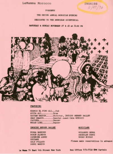 Inossis Berber Ballet Theatre 1968. Image credit the Oukarims archive.���My story is quite different,��� he explained in between book signings, ���but it���s a very American story.��� Next to him stood an old-time friend, Mrabet, who was wearing a ���star-spangled djellaba.��� The ���red, white, and blue��� robe, visitors were told, was designed for Mick Jagger for his visit to Morocco in 1989.
