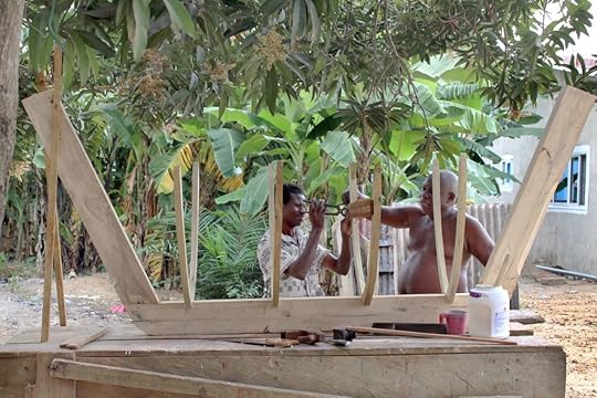 Paa��Joe and Samuel��Nahr��work frame a boat coffin. Image courtesy of author.These increasingly elaborate ���fantasy��� forms are most often created for collection and exhibition rather than burial. While I was at the workshop, the staff��was��working on a variety of projects including an ear of corn coffin for a farmer���s burial, lion palanquins for local chiefs, and a series of sea-themed coffins for an exhibition in Accra. These commissions, which are never intended to enter the ground, give the artists the opportunity to exhibit their skill to wider audiences.