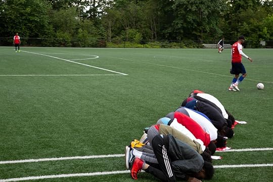 FC Juba players break from pre-game warm-ups for prayer. The majority of the squad come from immigrant communities originating in the Horn of Africa, some of the largest African diasporic communities in the Seattle region and across the Pacific Northwest.