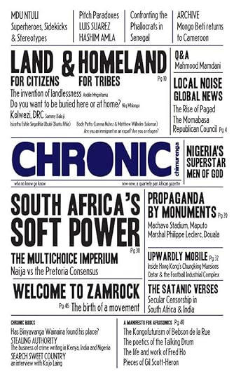 The Chronic features writing and artwork from filmmaker Jean-Pierre Bekolo, writer Binyanvanga Wainaina, Rustum Kostain and Nic Mhlongo, academics Dominique Malaquais and Mahmood Mamdani, provocateur Andile Mngxitama, Gwen Ansell, Patrice Nganang, Achal Prabhala, Karen Press, Paula Akugizibwe, Tolu Ogunlesi, AIAC’s Sean Jacobs (who was also present for some of the early issues as a contributing editor), Harmony Holiday, Howard French, Billy Kahora and others.