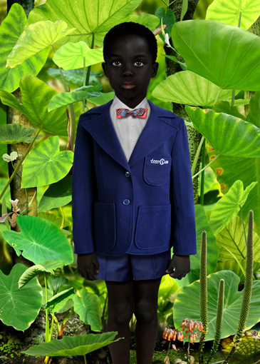 About a month ago, we came across the ‘World’ series by Dutch photographer Ruud van Empel. Initially, his art stood out because of the ‘race’ and age of his models, the majority of whom are black children. Since the artist, as we soon learned, grew up in a small and rather homogeneously white southern Dutch town, it seemed unlikely that this apparent preference simply occurred by chance. But it wasn’t just the race factor that got us interested in asking Ruud some questions about his models. There was something odd about the entire style, demeanor and surroundings of these kids. Almost all of them are exquisitely groomed in what looks like Dutch middle-class attire from the 60s and surrounded by an almost perfect scene of tropical nature; quite a wondrous contrast in itself. On top of that, all these different forests seem to breathe a peculiar sort of ambiance. Perfectly ordered yet sinister, the lakes, trees and leafs are inviting and foreboding at the same time. The children don’t seem to be intimidated by it, though. They look at you with eyes wide open. Bold. Innocent. Confident. But there’s something uncanny about their look. Their innocence seems tainted. The reason for this oddness, we soon find out, is because we are looking in the eyes of people who don’t exist and never have. Instead, they are photoshopped into being through a patchwork of noses, arms, eyes and lips.