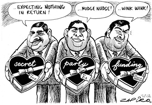 Among the rumours swirling around the Guptas: that they brokered a deal that benefits them and Duduzane Zuma (the son of Jacob Zuma), becoming co-shareholders in a deal with China Railway Construction Corporation, and another “R9-billion empowerment deal” with Indian-Swiss megacorporation ArcelorMittal. (The Gupta family has set up a WordPress blog to establish the facts and address what they call “this ‘perception-mongering’” by the South African media here.) Given all this, it’s no wonder that the Three Brothers Gupta would become Zapiro subjects.
