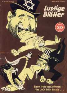 Second, cartoons from the Nazi era certainly make the linkages between Shapiro’s Guptas and theirs clear: see here (Polish cartoon depicting Jewish people as fat/well off while blaming the poor for their poverty), and the one left, promoting the Nazi claim that the Jews were behind World War II, having orchestrated it to destroy Nazi Germany (The caption: “One eats the other and the Jew devours them all…”). Source: Lustige Blätter, a weekly German humor magazine; issue #29/1943.