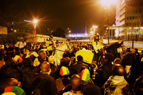 Imagine thousands of people leaving a football game at the same time. Amongst those people, some English, some Ghanaian, there were police officers on horses. Barely any room for us to move and now we have to clear the way for horses. Although there was some playful taunting of the officers it was pretty harmless.