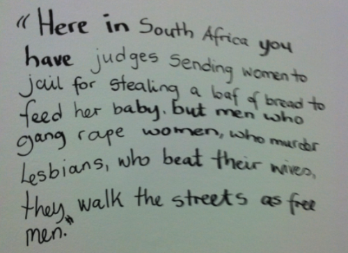 No. The night of the opening, the space among the pictures, the testimonies, and the videos was a space of celebration, of hugs and winks and laughter and more hugs, a space of joy. When the communities of local Black lesbians and their friends came together, the event created the joyous space. It was an opening. For one night, in South Africa, the work of mourning is the work of morning.