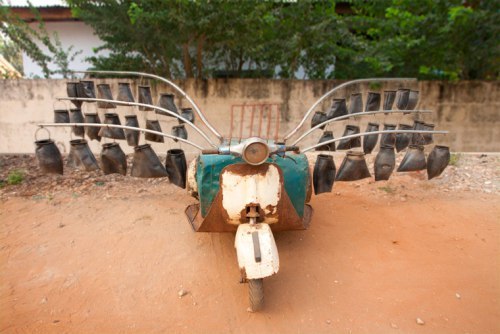 Romuald Hazoumé’s third solo exhibition at The October Gallery, Cargoland, is a re-appropriated and extended title — a familiar technique for those who follow his work. A play on ‘cargo’, which translates in West African French to mean “anything of weight and value that needs to be transported,” the Cargoland presented within the gallery space is largely commanded by two mixed media installations entitled ‘Water Cargo’ and ‘Petrol Cargo’, two large tricycle scooters re-fashioned to bear the transportation of loads beyond their original design.