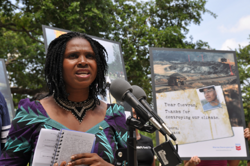 This year, Chevron let Emem Okon speak – for a whole two minutes. In two minutes, Emem Okon had enough time to state the obvious. Chevron lies in its reports from the Niger Delta. Chevron’s activities in the Niger Delta – poisoning the water, ruining the land, devastating the local economies – directly attack women: women as fisher-folk and as farmers, women as mothers, women as community members, women as women: “The women of the Niger Delta call on Chevron and every other oil company to leave the Niger Delta oil under the ground. Stop destroying our environment. Let our oil be.”