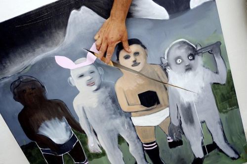 A second example is the work which depicts a trail of ants coming out of a schoolbag forming the words “Glory to God”. Though considered blasphemous by the rioters, the canvas did not attempt to depict Allah in a figural manner, which is prescribed against in Islamic doctrine. Its message is also in keeping with a section of the Qur’an, the Surat An-Naml (27:16-19). Its playful use of the insect as an artistic medium, calls upon the viewer to re-examine the verse, and the place of the very small, and potential overlooked (who do indeed have a voice, even a female voice!), in society.