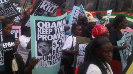 Remember “Silence = Death”? There’s more. Withholding = Death. Withholding necessary funds. Withholding lifesaving medications. Withholding life. In Nairobi last week, Patricia Asero Ochieng, Lucy Ghati, and Rose Kaberia joined Maureen and Anyango and many others to raise a ruckus about the trickle of Pepfar funding for people in Kenya living with AIDS. In particular, they were raising their voices, placards and fists over $500 million dollars allocated but not yet spent for antiretroviral medications. That’s a lot of money, drugs, and lost lives. And of course all the major agencies blame all the other major agencies. US officials argue it’s Kenyan ministerial inefficiencies. Kenyan officials take one of two lines: it’s US processes, or, it’s all fine and you’re overreacting.