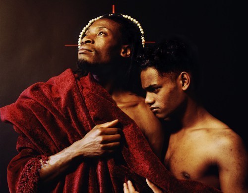Fani-Kayode's work with his partner Alex Hirst okayed an important role in art's response to the AIDS epidemic, in their series 'Ecstatic Antibodies' (presented in a 1990 group exhibition of the same name). The artists described the aim of this work as "the 'alchemical' or 'ritual' production of spiritual antibodies". This ambition — constructing aesthetic edifices eluding to elusive protective veils — is most closely contemporary to the work of queer artists such as David Wojnarowicz and filmmaker Derek Jarman; the staging of quasi-religious scenes are reminiscent of Jarman's queering of Genesis, The Garden (1990).