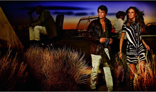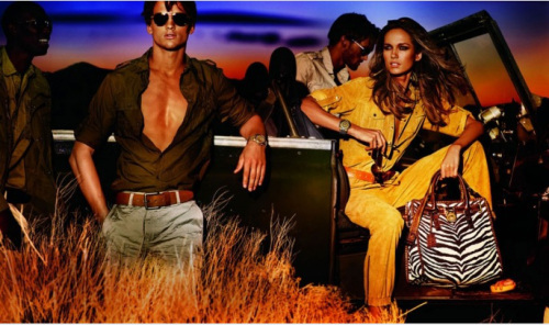 Kors's spring 2012 collection, named "Afriluxe," was "inspired by the 'rustic modernism of the Lebombo Lodge,' a reportedly $1,500 per night resort in South Africa, and featured dirty-looking earth tone caftans and cargo pants and cashmere sweaters with holes in them," as Fashionista quips. That's one of the images from the print campaign above. Here's another from the look book.